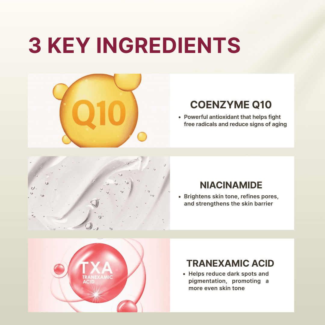 - Tranexamic Acid(Helps reduce dark spots and pigmentation, promoting a more even skin tone..)