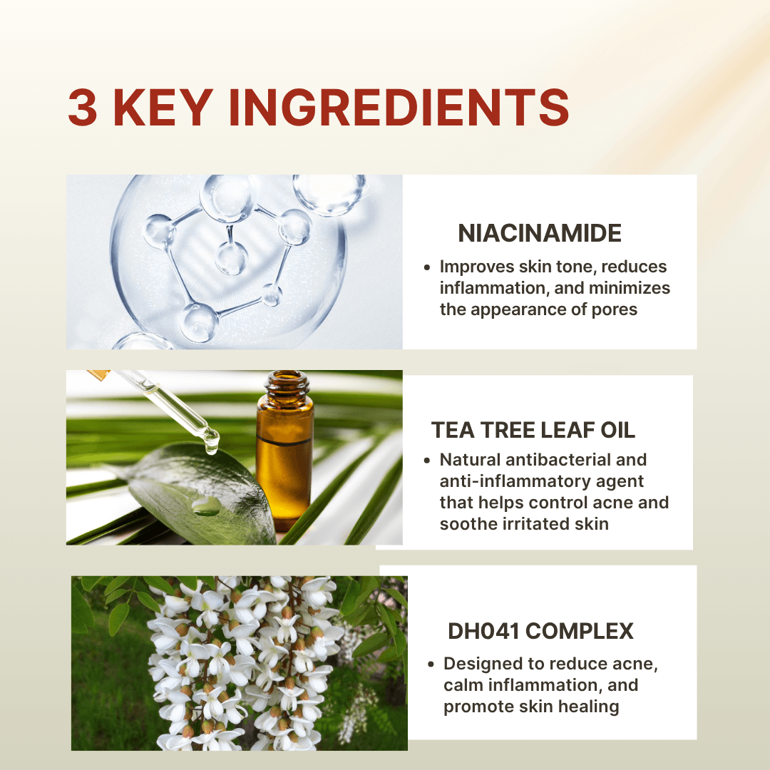 - DH041 Complex (Patent-Pending Blend) (A powerful botanical formula including Sophora Flavescens Root, Curcuma Aromatica, Salvia Miltiorrhiza, Kaempferia Galanga Root, and Willow Bark Extract, designed to reduce acne, calm inflammation, and promote skin healing.)