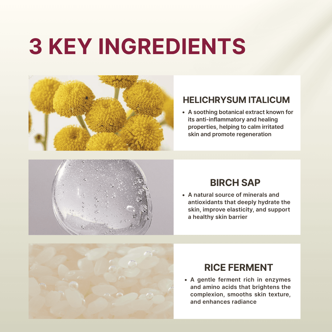 - Rice Ferment (A gentle ferment rich in enzymes and amino acids that brightens the complexion, smooths skin texture, and enhances radiance.)
